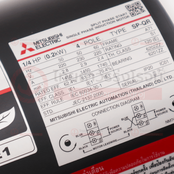 MITSUBISHI มอเตอร์ SP-QR 1/4HP 4P 220v 1450รอบ เพลา14mm IP20