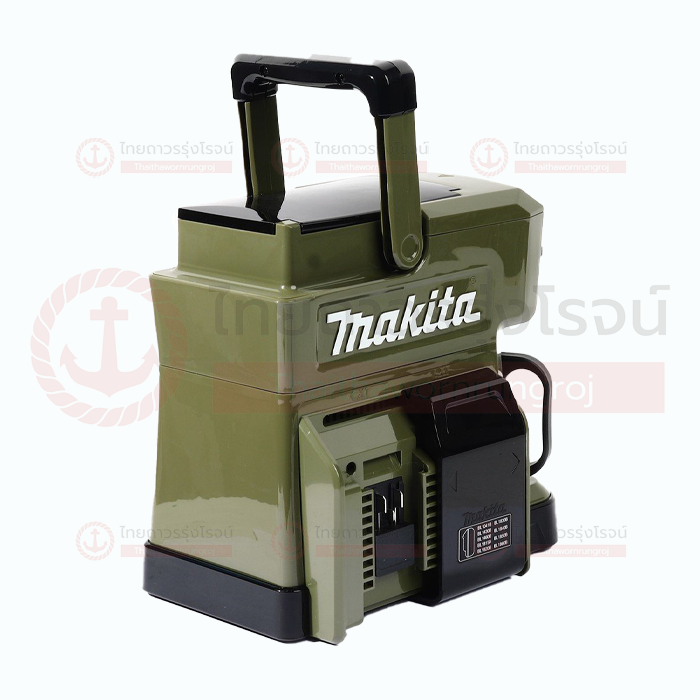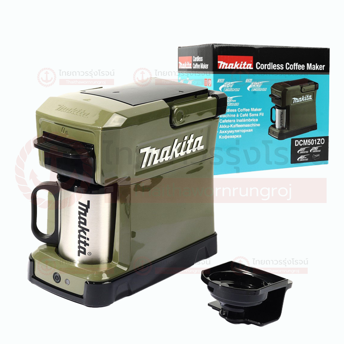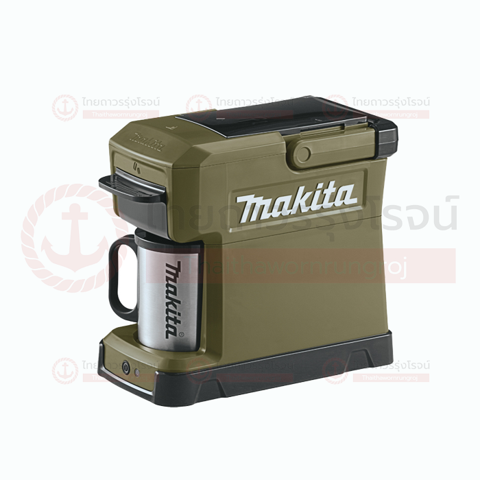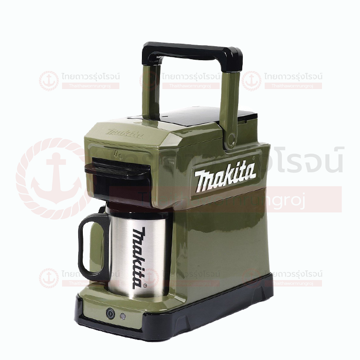 Makita เครื่องชงกาแฟไร้สาย พร้อมถ้วย รุ่น DCM501Z (เครื่องเปล่า+กล่องกระดาษ) 18v สีเขียว ดีไซน์ออกแบบตัวเครื่องนั้น ดูแล้วก็รู้ได้เลยว่าเหมือนกับเครื่องมือช่าง(ยิ่งมียี่ห้อแปะอยู่ด้วย) ตัวเครื่องดูแข็งแกรงบึกบึน คุณสมบัติพิเศษของมันคือ เครื่องชงกาแฟแบบพกพา ที่ยกไปใช้งานที่ไหนก็ได้ โดยแหล่งพลังงานที่ใช้ ก็จะเป็นแบตเตอรี่แบบมาตรฐานที่ใช้ในเครื่องมือช่างของ Makita เอง โดยแบตเตอรี่ แบบ LI-ION 18V จะสามารถชงกาแฟได้ประมาณ 160 มิลลิลิตร หรือประมาณ 4 แก้ว ต้องบอกว่า นี่ไม่ใช่เครื่องชงกาแฟรุ่นแรกที่ Makita ผลิตออกมา มีด้ามจับพกพาสะดวก มาพร้อมแก้วแสตนเลส และฝาป้องกันฝุ่น
