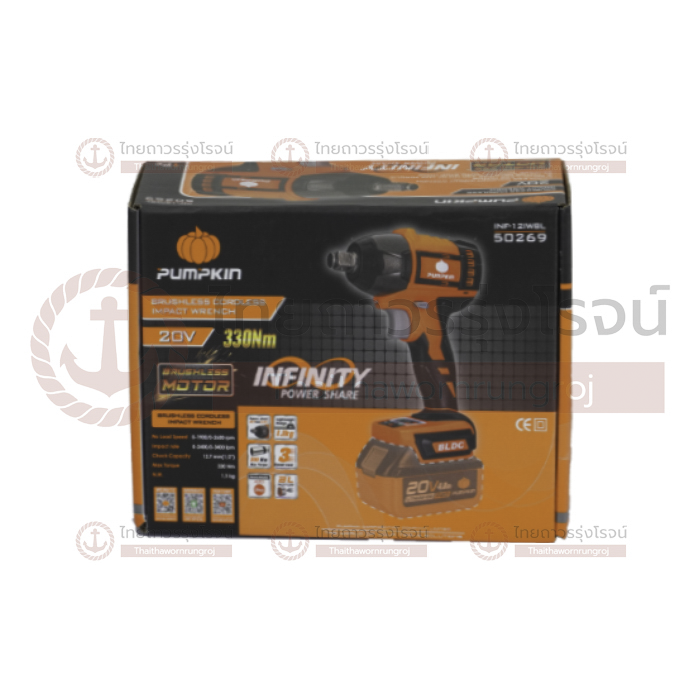 • PUMPKIN บล็อกกระแทกไร้สาย 1/2นิ้ว ไร้แปรงถ่าน 20v Li-ion รุ่น INF-12IWBL 50269 เครื่องเปล่า + กล่องกระดาษ 1 ชิ้น